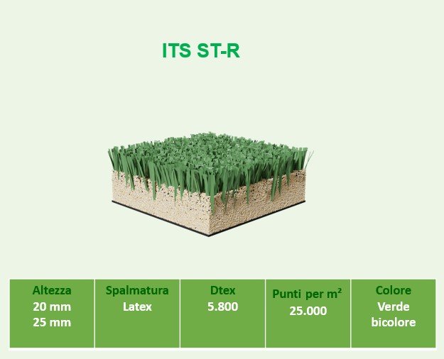 L’ITS ST-R è l’erba sintetica ideale per l’utilizzo multisport, per via della sua resistenza a qualunque inconveniente che possa danneggiarla. L’ITS ST-R è totalmente realizzato in polietilene prefibrillato garantendo così sia ottime prestazioni riguardante il rimbalzo della palla, per via del suo intaso che è costituito unicamente da sabbia silicea, che sia sui movimenti corti e rapidi del giocatore.